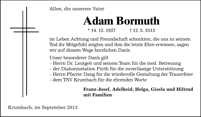 Hier finden Sie alle Traueranzeigen aus der Zeitung, die bisher für Adam Bormuth erschienen sind. Weitere Traueranzeigen, die in der Zeitung erscheinen, werden hier ebenfalls aufgelistet