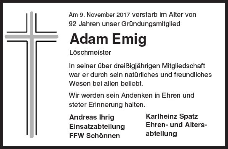 Hier finden Sie alle Traueranzeigen aus der Zeitung, die bisher für Adam Emig erschienen sind. Weitere Traueranzeigen, die in der Zeitung erscheinen, werden hier ebenfalls aufgelistet