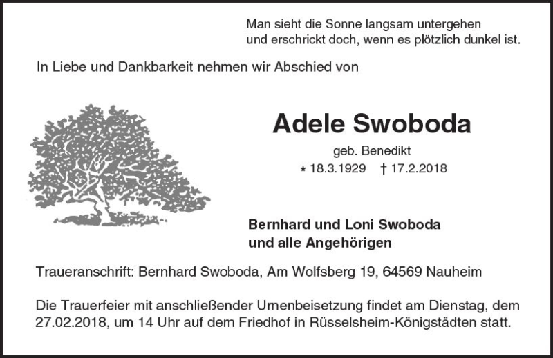 Hier finden Sie alle Traueranzeigen aus der Zeitung, die bisher für Adele Swoboda erschienen sind. Weitere Traueranzeigen, die in der Zeitung erscheinen, werden hier ebenfalls aufgelistet