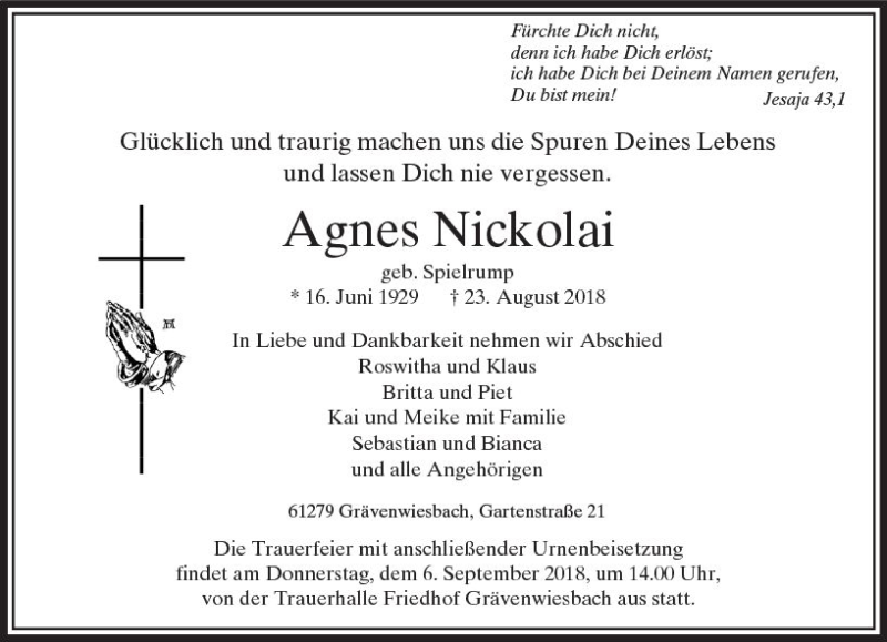 Hier finden Sie alle Traueranzeigen aus der Zeitung, die bisher für Agnes Nickolai erschienen sind. Weitere Traueranzeigen, die in der Zeitung erscheinen, werden hier ebenfalls aufgelistet