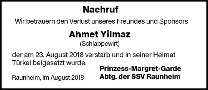 Hier finden Sie alle Traueranzeigen aus der Zeitung, die bisher für Ahmet Yilmaz erschienen sind. Weitere Traueranzeigen, die in der Zeitung erscheinen, werden hier ebenfalls aufgelistet