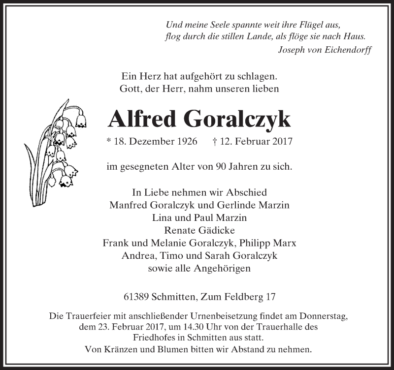 Hier finden Sie alle Traueranzeigen aus der Zeitung, die bisher für Alfred Goralczyk erschienen sind. Weitere Traueranzeigen, die in der Zeitung erscheinen, werden hier ebenfalls aufgelistet