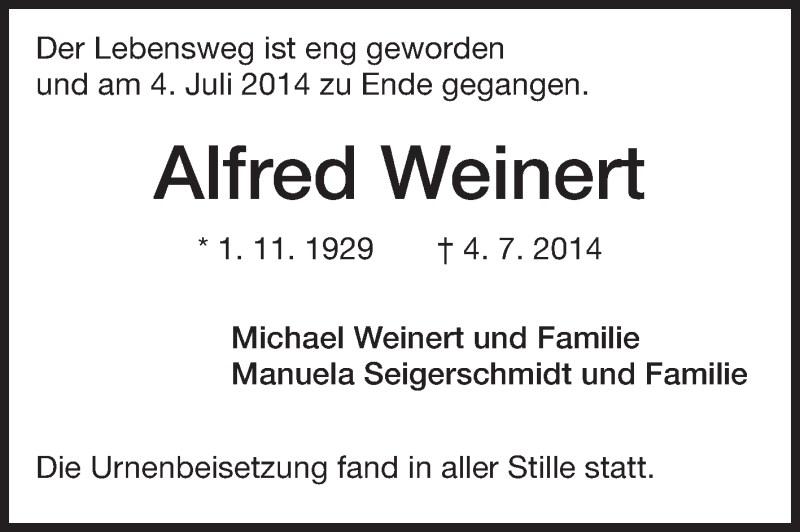 Hier finden Sie alle Traueranzeigen aus der Zeitung, die bisher für Alfred Weinert erschienen sind. Weitere Traueranzeigen, die in der Zeitung erscheinen, werden hier ebenfalls aufgelistet