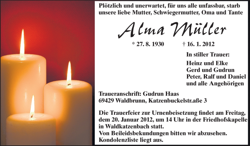 Hier finden Sie alle Traueranzeigen aus der Zeitung, die bisher für Alma Müller erschienen sind. Weitere Traueranzeigen, die in der Zeitung erscheinen, werden hier ebenfalls aufgelistet
