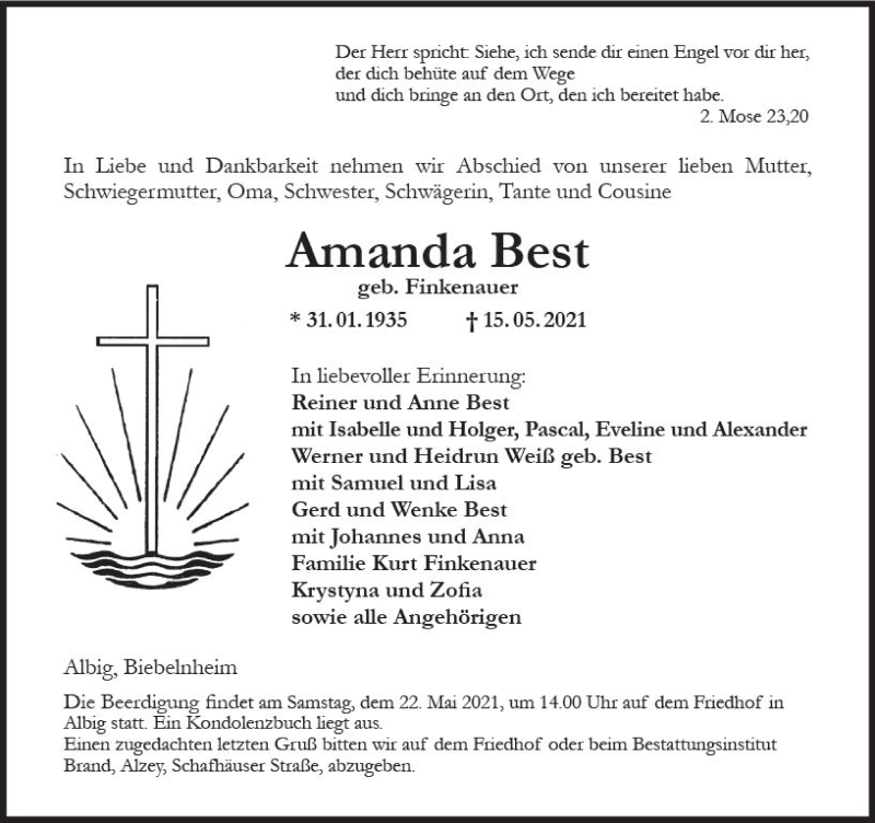 Hier finden Sie alle Traueranzeigen aus der Zeitung, die bisher für Amanda Best erschienen sind. Weitere Traueranzeigen, die in der Zeitung erscheinen, werden hier ebenfalls aufgelistet
