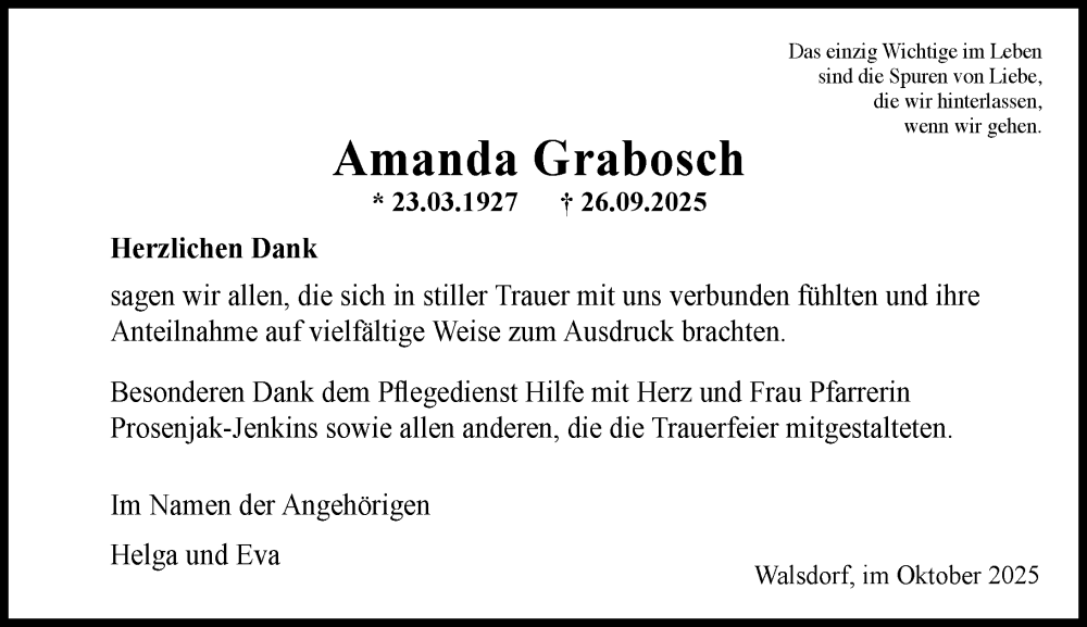 Hier finden Sie alle Traueranzeigen aus der Zeitung, die bisher für Amanda Grabosch erschienen sind. Weitere Traueranzeigen, die in der Zeitung erscheinen, werden hier ebenfalls aufgelistet