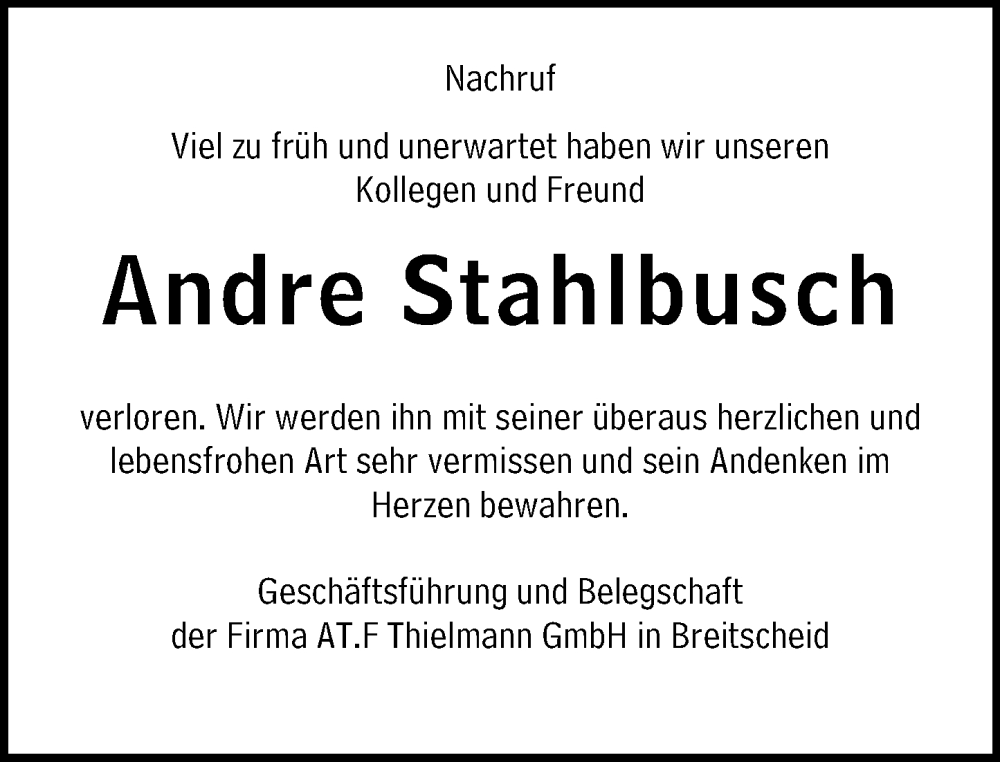 Hier finden Sie alle Traueranzeigen aus der Zeitung, die bisher für Andre Stahlbusch erschienen sind. Weitere Traueranzeigen, die in der Zeitung erscheinen, werden hier ebenfalls aufgelistet