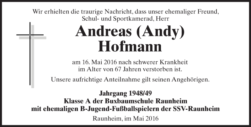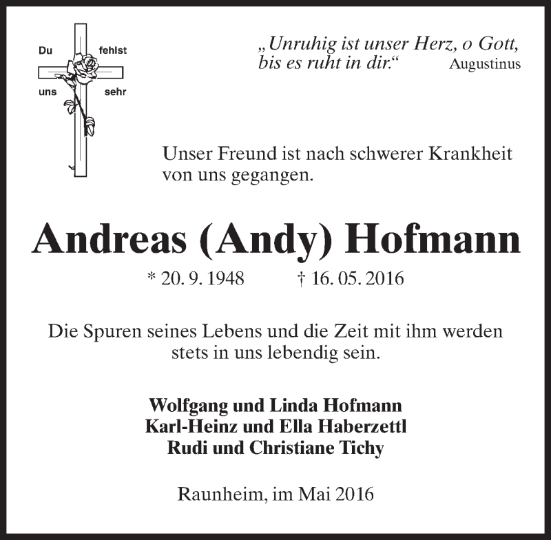 Hier finden Sie alle Traueranzeigen aus der Zeitung, die bisher für Andreas Hofmann erschienen sind. Weitere Traueranzeigen, die in der Zeitung erscheinen, werden hier ebenfalls aufgelistet