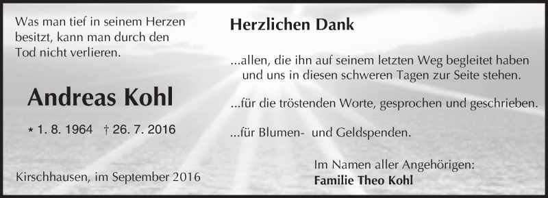 Hier finden Sie alle Traueranzeigen aus der Zeitung, die bisher für Andreas Kohl erschienen sind. Weitere Traueranzeigen, die in der Zeitung erscheinen, werden hier ebenfalls aufgelistet