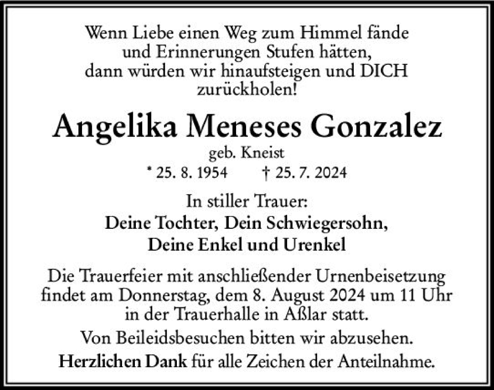 Hier finden Sie alle Traueranzeigen aus der Zeitung, die bisher für Angelika Meneses Gonzalez erschienen sind. Weitere Traueranzeigen, die in der Zeitung erscheinen, werden hier ebenfalls aufgelistet