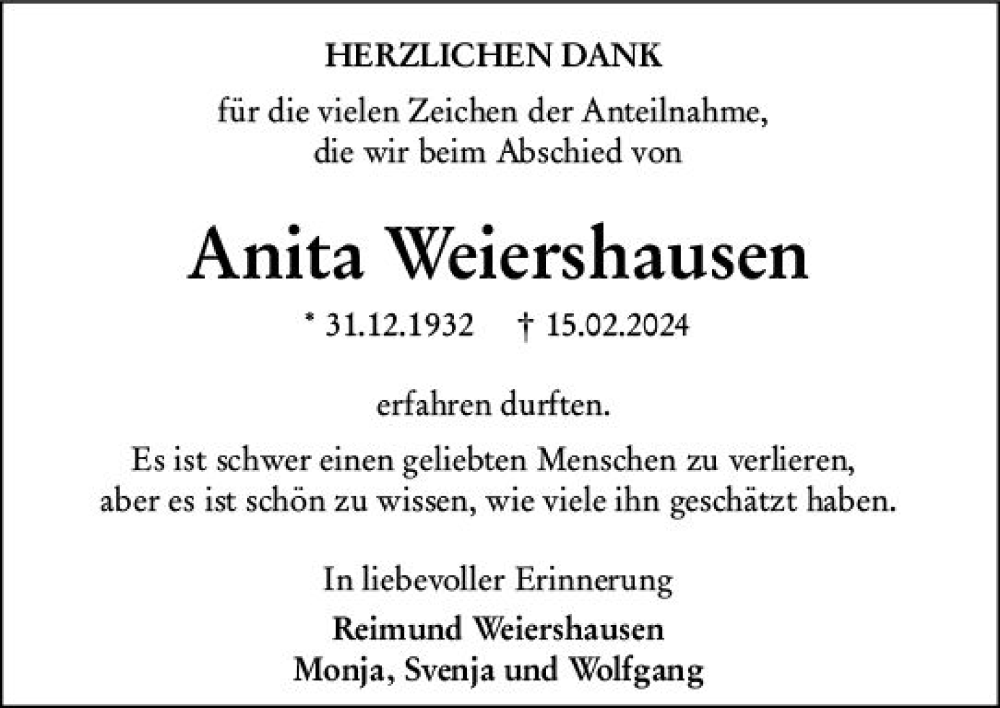 Hier finden Sie alle Traueranzeigen aus der Zeitung, die bisher für Anita Weiershausen erschienen sind. Weitere Traueranzeigen, die in der Zeitung erscheinen, werden hier ebenfalls aufgelistet