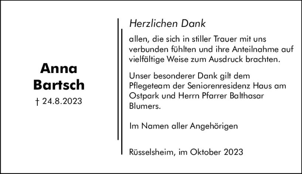 Hier finden Sie alle Traueranzeigen aus der Zeitung, die bisher für Anna Bartsch erschienen sind. Weitere Traueranzeigen, die in der Zeitung erscheinen, werden hier ebenfalls aufgelistet