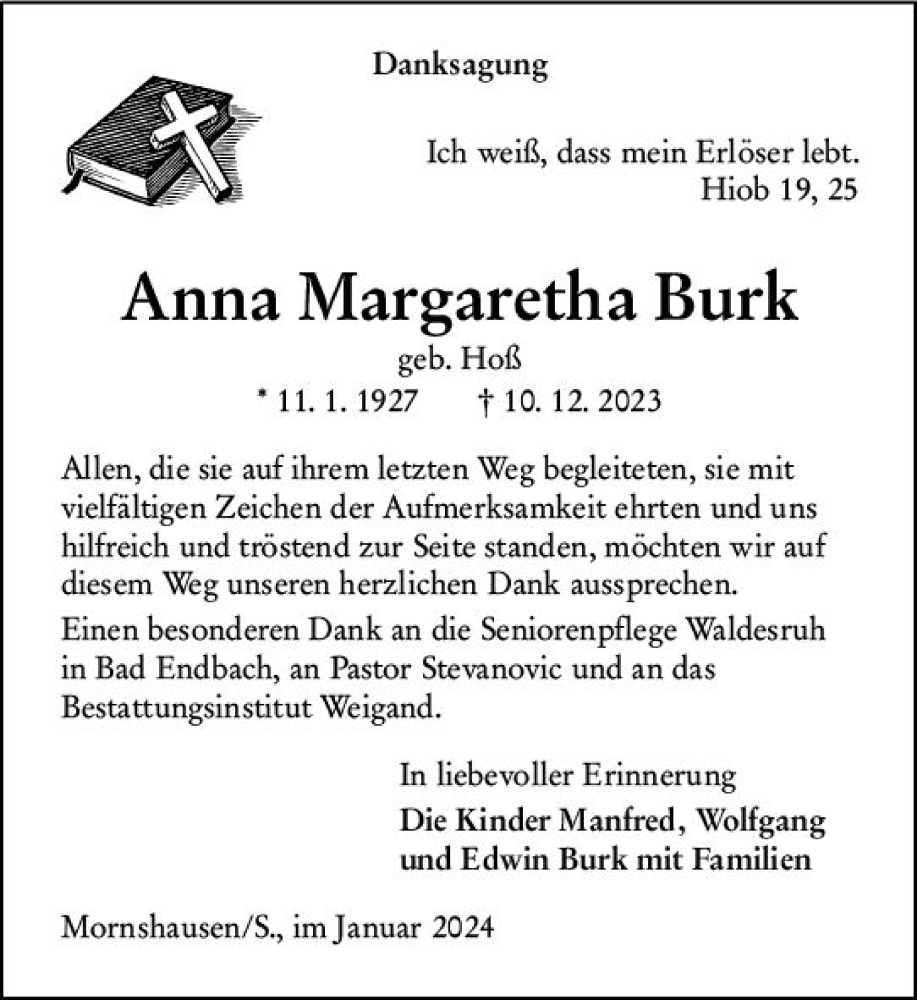 Hier finden Sie alle Traueranzeigen aus der Zeitung, die bisher für Anna Margaretha Burk erschienen sind. Weitere Traueranzeigen, die in der Zeitung erscheinen, werden hier ebenfalls aufgelistet