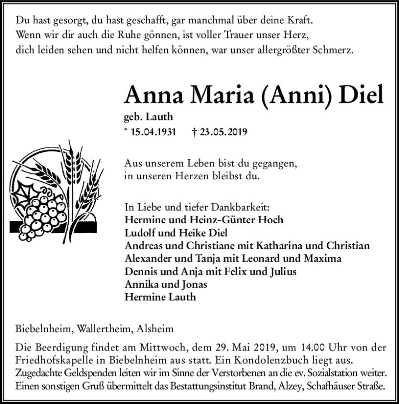 Hier finden Sie alle Traueranzeigen aus der Zeitung, die bisher für Anna Maria (Anni) Diel erschienen sind. Weitere Traueranzeigen, die in der Zeitung erscheinen, werden hier ebenfalls aufgelistet