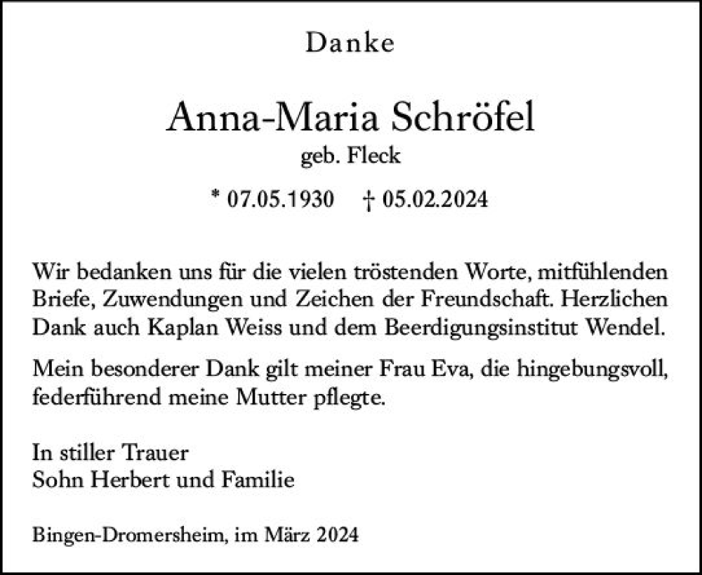 Hier finden Sie alle Traueranzeigen aus der Zeitung, die bisher für Anna-Maria Schröfel erschienen sind. Weitere Traueranzeigen, die in der Zeitung erscheinen, werden hier ebenfalls aufgelistet