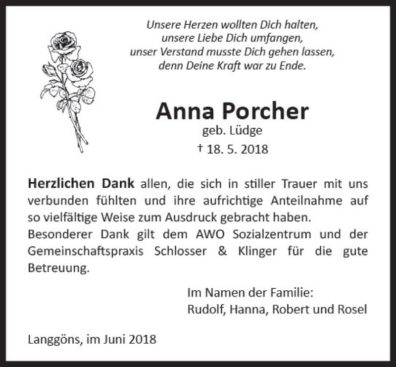 Hier finden Sie alle Traueranzeigen aus der Zeitung, die bisher für Anna Porcher erschienen sind. Weitere Traueranzeigen, die in der Zeitung erscheinen, werden hier ebenfalls aufgelistet