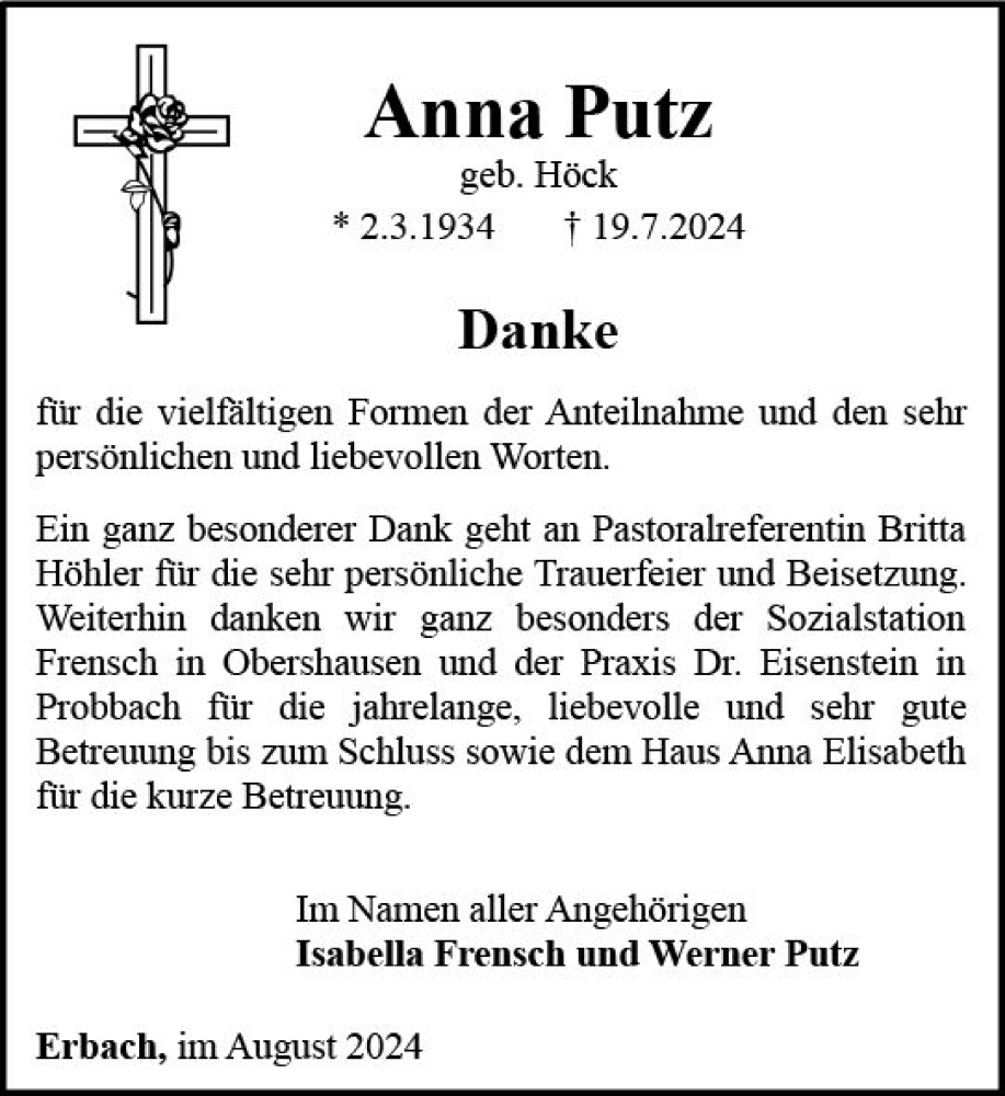 Hier finden Sie alle Traueranzeigen aus der Zeitung, die bisher für Anna Putz erschienen sind. Weitere Traueranzeigen, die in der Zeitung erscheinen, werden hier ebenfalls aufgelistet
