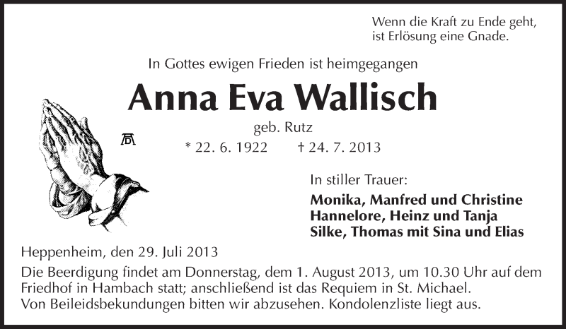 Hier finden Sie alle Traueranzeigen aus der Zeitung, die bisher für Anna Eva Wallisch erschienen sind. Weitere Traueranzeigen, die in der Zeitung erscheinen, werden hier ebenfalls aufgelistet