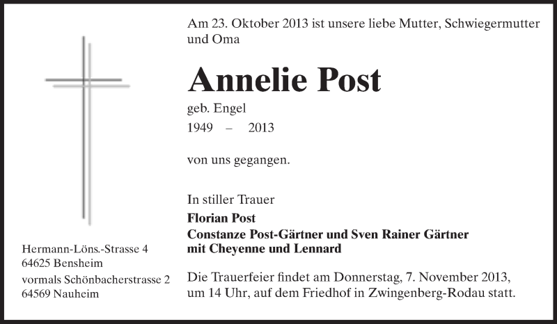 Hier finden Sie alle Traueranzeigen aus der Zeitung, die bisher für Annelie Post erschienen sind. Weitere Traueranzeigen, die in der Zeitung erscheinen, werden hier ebenfalls aufgelistet