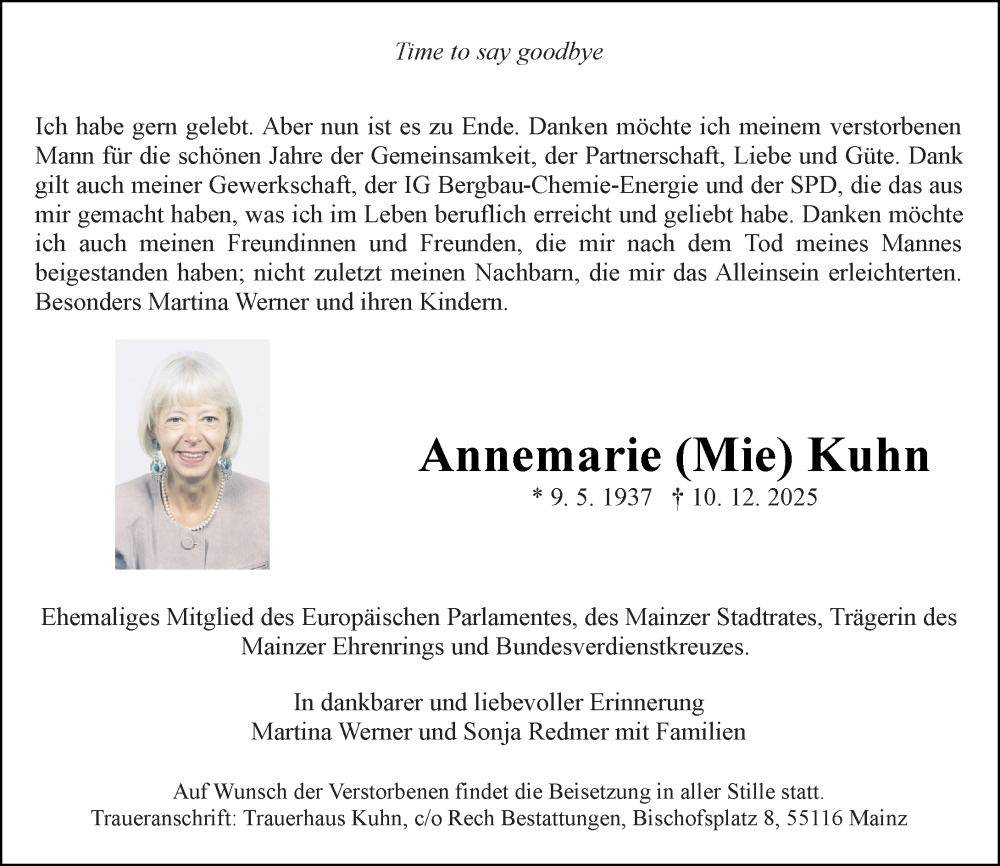 Hier finden Sie alle Traueranzeigen aus der Zeitung, die bisher für Annemarie Kuhn erschienen sind. Weitere Traueranzeigen, die in der Zeitung erscheinen, werden hier ebenfalls aufgelistet