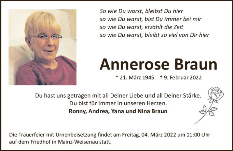 Hier finden Sie alle Traueranzeigen aus der Zeitung, die bisher für Annerose Braun erschienen sind. Weitere Traueranzeigen, die in der Zeitung erscheinen, werden hier ebenfalls aufgelistet