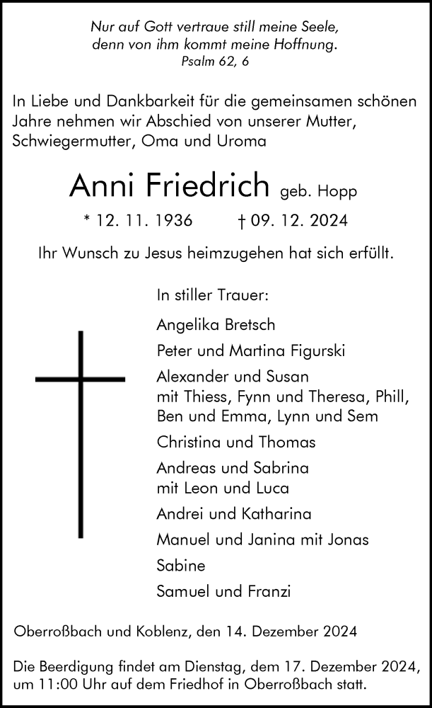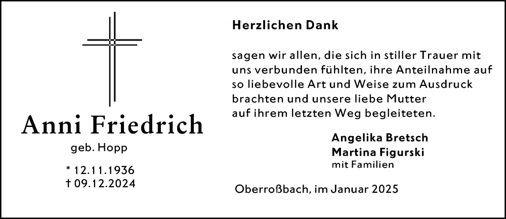 Hier finden Sie alle Traueranzeigen aus der Zeitung, die bisher für Anni Friedrich erschienen sind. Weitere Traueranzeigen, die in der Zeitung erscheinen, werden hier ebenfalls aufgelistet