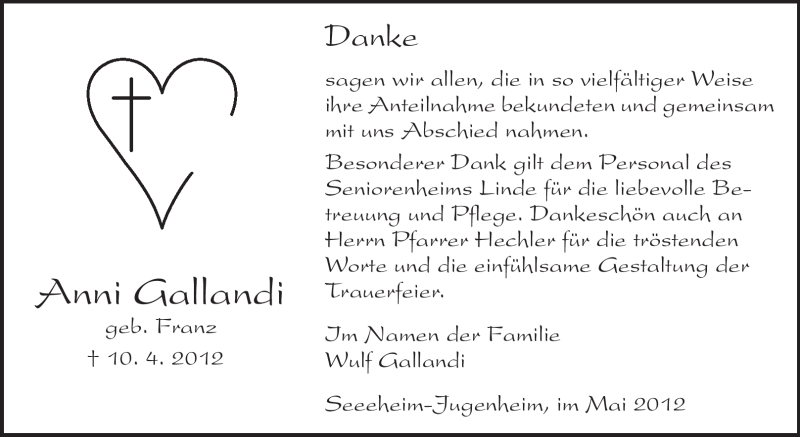Hier finden Sie alle Traueranzeigen aus der Zeitung, die bisher für Anni Gallandi erschienen sind. Weitere Traueranzeigen, die in der Zeitung erscheinen, werden hier ebenfalls aufgelistet