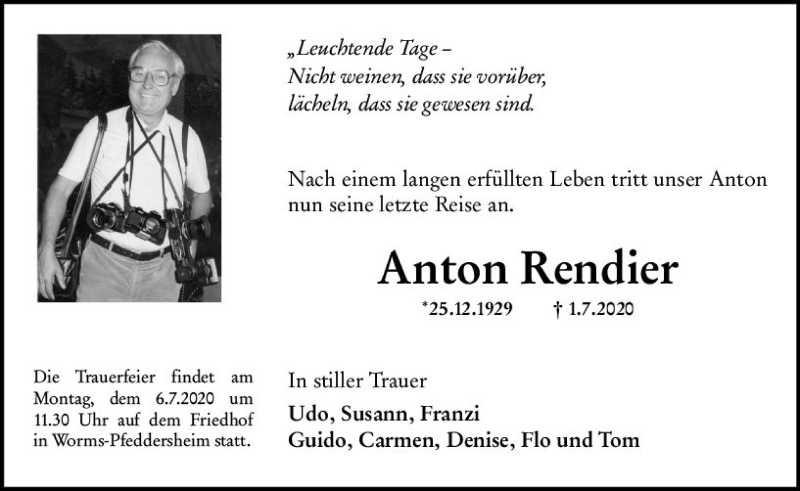 Hier finden Sie alle Traueranzeigen aus der Zeitung, die bisher für Anton Rendier erschienen sind. Weitere Traueranzeigen, die in der Zeitung erscheinen, werden hier ebenfalls aufgelistet