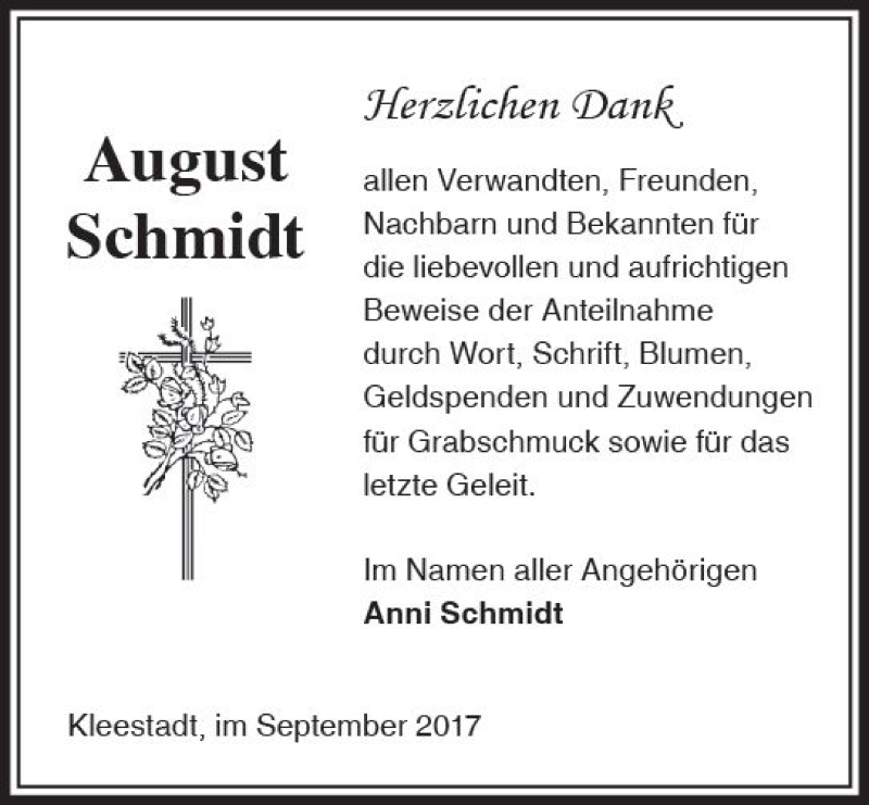 Hier finden Sie alle Traueranzeigen aus der Zeitung, die bisher für August Schmidt erschienen sind. Weitere Traueranzeigen, die in der Zeitung erscheinen, werden hier ebenfalls aufgelistet