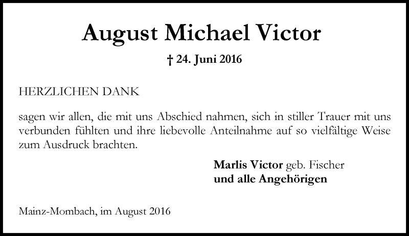 Hier finden Sie alle Traueranzeigen aus der Zeitung, die bisher für August Michael Victor erschienen sind. Weitere Traueranzeigen, die in der Zeitung erscheinen, werden hier ebenfalls aufgelistet