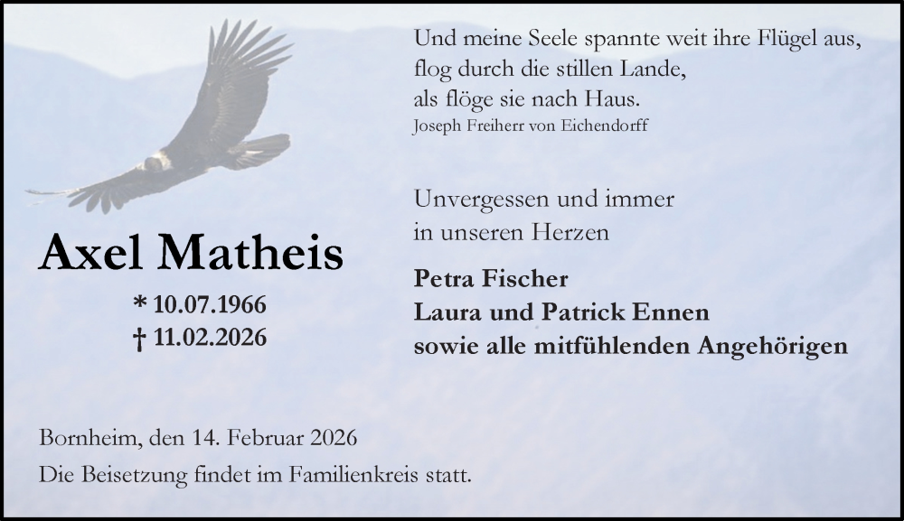 Hier finden Sie alle Traueranzeigen aus der Zeitung, die bisher für Axel Matheis erschienen sind. Weitere Traueranzeigen, die in der Zeitung erscheinen, werden hier ebenfalls aufgelistet