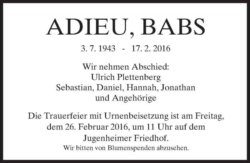 Hier finden Sie alle Traueranzeigen aus der Zeitung, die bisher für Babs erschienen sind. Weitere Traueranzeigen, die in der Zeitung erscheinen, werden hier ebenfalls aufgelistet