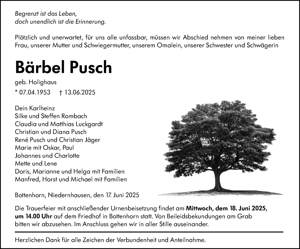Hier finden Sie alle Traueranzeigen aus der Zeitung, die bisher für Bärbel Pusch erschienen sind. Weitere Traueranzeigen, die in der Zeitung erscheinen, werden hier ebenfalls aufgelistet
