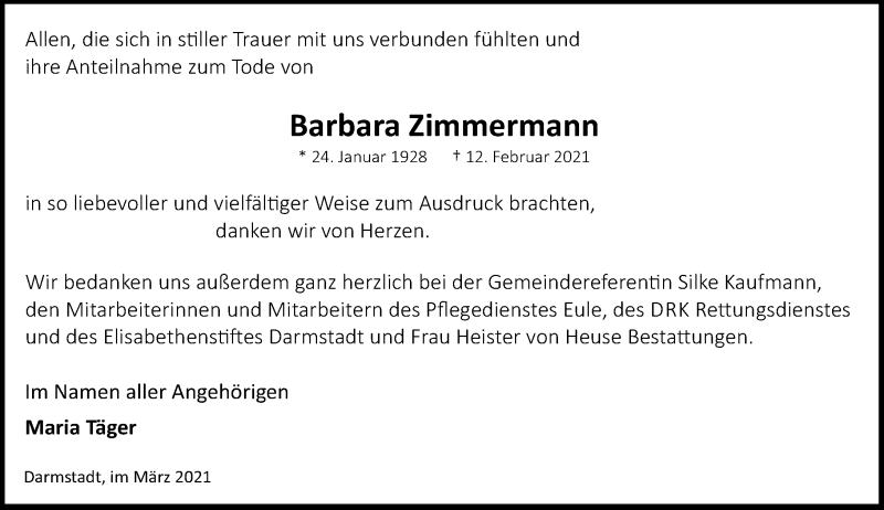 Hier finden Sie alle Traueranzeigen aus der Zeitung, die bisher für Barbara Zimmermann erschienen sind. Weitere Traueranzeigen, die in der Zeitung erscheinen, werden hier ebenfalls aufgelistet