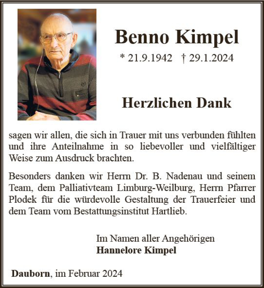 Hier finden Sie alle Traueranzeigen aus der Zeitung, die bisher für Benno Kimpel erschienen sind. Weitere Traueranzeigen, die in der Zeitung erscheinen, werden hier ebenfalls aufgelistet