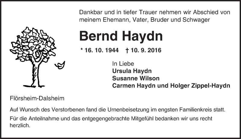 Hier finden Sie alle Traueranzeigen aus der Zeitung, die bisher für Bernd Haydn erschienen sind. Weitere Traueranzeigen, die in der Zeitung erscheinen, werden hier ebenfalls aufgelistet