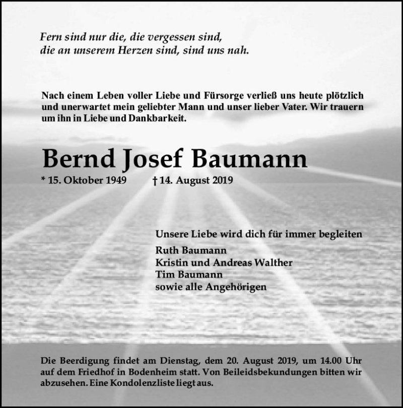Hier finden Sie alle Traueranzeigen aus der Zeitung, die bisher für Bernd Josef Baumann erschienen sind. Weitere Traueranzeigen, die in der Zeitung erscheinen, werden hier ebenfalls aufgelistet