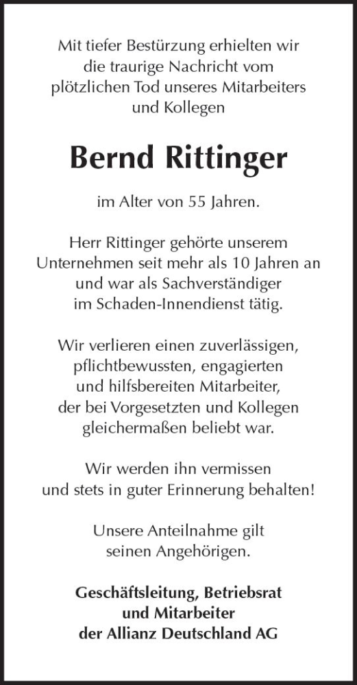 Hier finden Sie alle Traueranzeigen aus der Zeitung, die bisher für Bernd Rittinger erschienen sind. Weitere Traueranzeigen, die in der Zeitung erscheinen, werden hier ebenfalls aufgelistet
