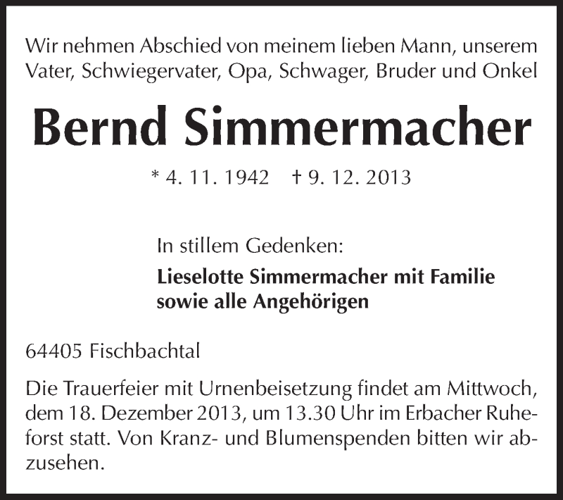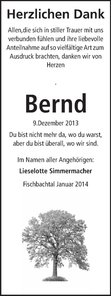 Hier finden Sie alle Traueranzeigen aus der Zeitung, die bisher für Bernd Simmermacher erschienen sind. Weitere Traueranzeigen, die in der Zeitung erscheinen, werden hier ebenfalls aufgelistet