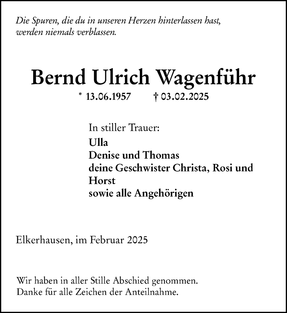 Hier finden Sie alle Traueranzeigen aus der Zeitung, die bisher für Bernd Ulrich Wagenführ erschienen sind. Weitere Traueranzeigen, die in der Zeitung erscheinen, werden hier ebenfalls aufgelistet