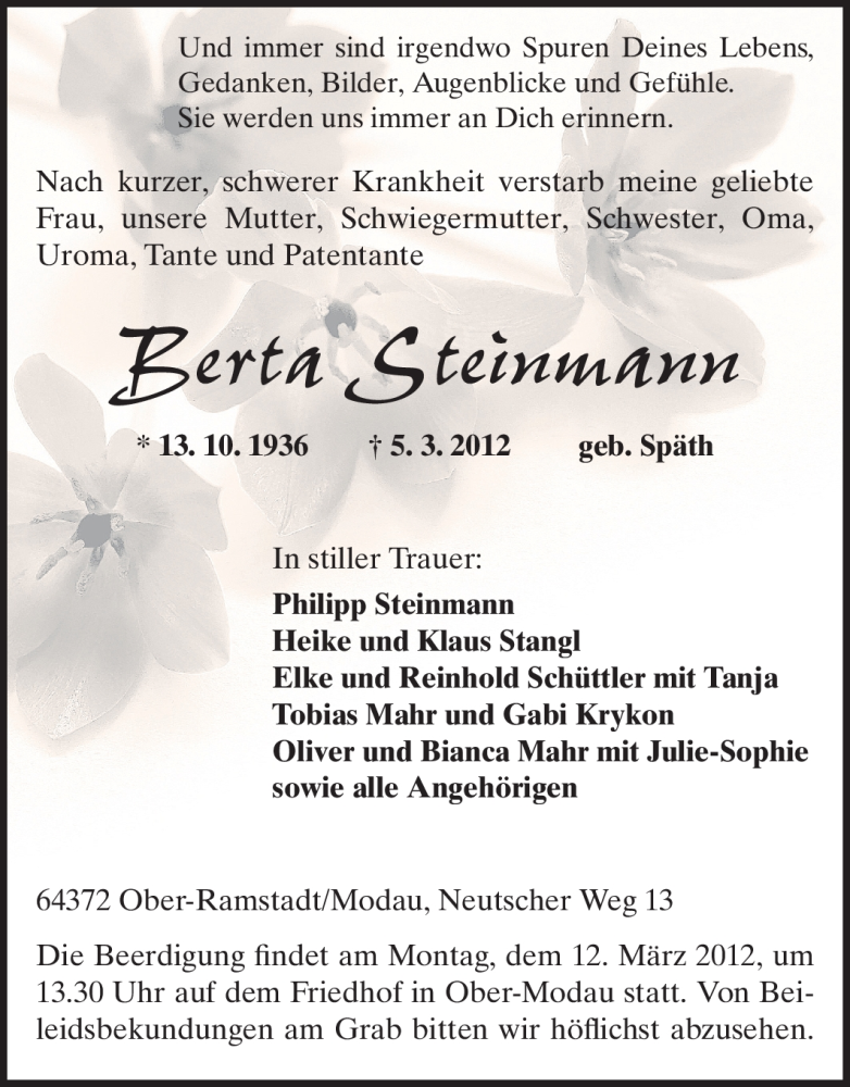Hier finden Sie alle Traueranzeigen aus der Zeitung, die bisher für Berta Steinmann erschienen sind. Weitere Traueranzeigen, die in der Zeitung erscheinen, werden hier ebenfalls aufgelistet