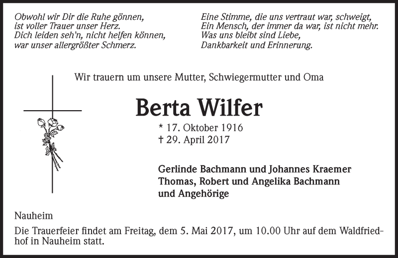 Hier finden Sie alle Traueranzeigen aus der Zeitung, die bisher für Berta Wilfer erschienen sind. Weitere Traueranzeigen, die in der Zeitung erscheinen, werden hier ebenfalls aufgelistet
