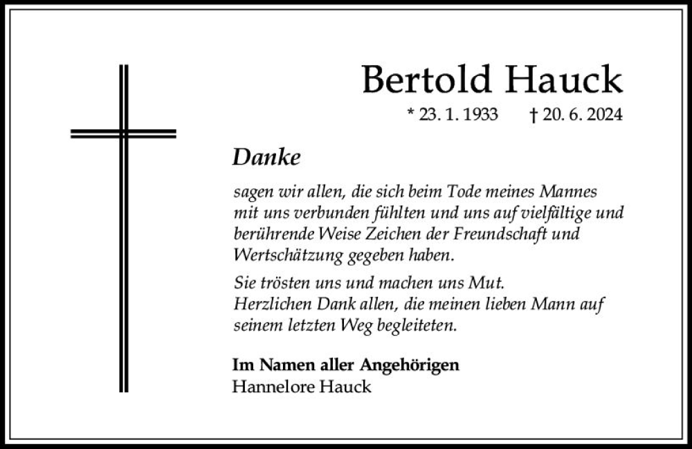 Hier finden Sie alle Traueranzeigen aus der Zeitung, die bisher für Bertold Hauck erschienen sind. Weitere Traueranzeigen, die in der Zeitung erscheinen, werden hier ebenfalls aufgelistet