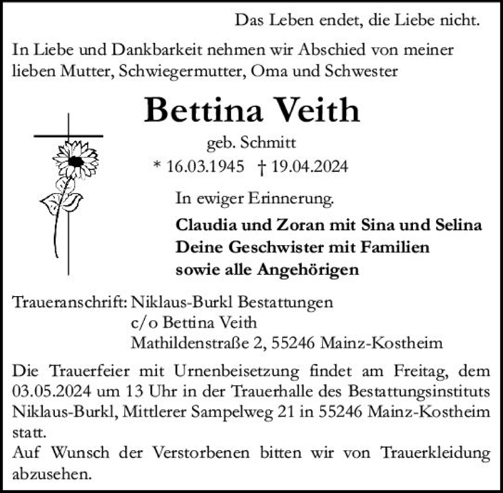 Hier finden Sie alle Traueranzeigen aus der Zeitung, die bisher für Bettina Veith erschienen sind. Weitere Traueranzeigen, die in der Zeitung erscheinen, werden hier ebenfalls aufgelistet