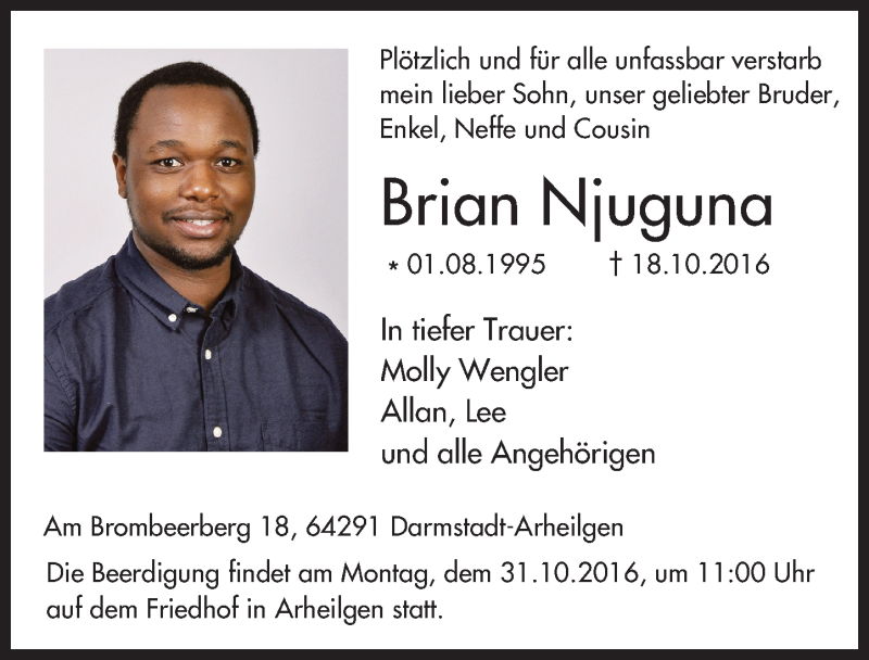 Hier finden Sie alle Traueranzeigen aus der Zeitung, die bisher für Brian Njuguna erschienen sind. Weitere Traueranzeigen, die in der Zeitung erscheinen, werden hier ebenfalls aufgelistet