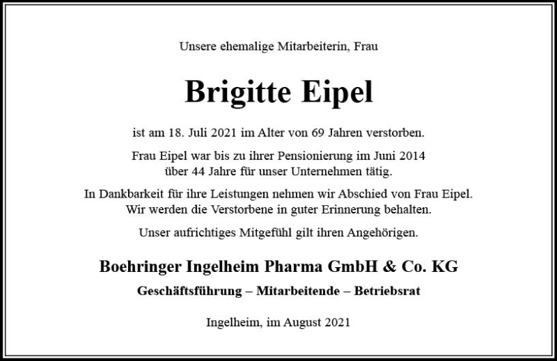 Hier finden Sie alle Traueranzeigen aus der Zeitung, die bisher für Brigitte Eipel erschienen sind. Weitere Traueranzeigen, die in der Zeitung erscheinen, werden hier ebenfalls aufgelistet