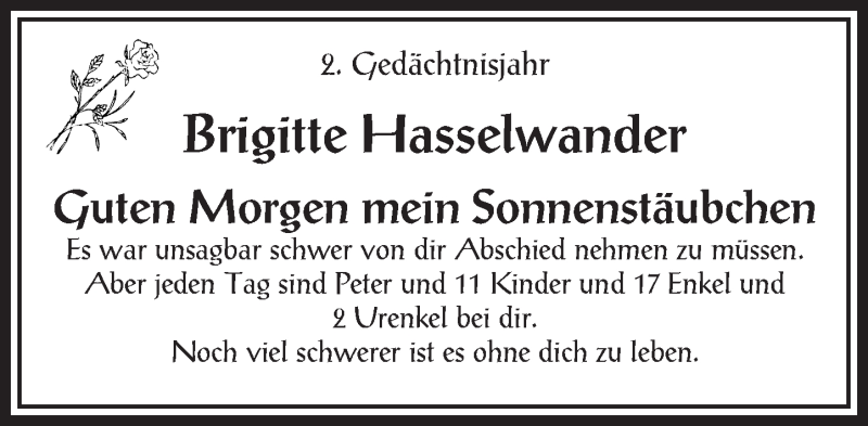 Hier finden Sie alle Traueranzeigen aus der Zeitung, die bisher für Brigitte Hasselwander erschienen sind. Weitere Traueranzeigen, die in der Zeitung erscheinen, werden hier ebenfalls aufgelistet