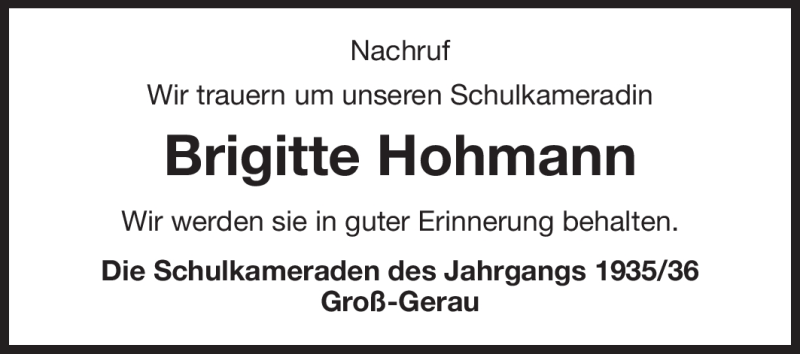 Hier finden Sie alle Traueranzeigen aus der Zeitung, die bisher für Brigitte Hohmann erschienen sind. Weitere Traueranzeigen, die in der Zeitung erscheinen, werden hier ebenfalls aufgelistet