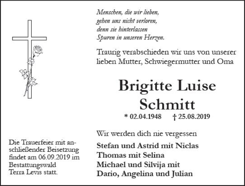 Hier finden Sie alle Traueranzeigen aus der Zeitung, die bisher für Brigitte Luise Schmitt erschienen sind. Weitere Traueranzeigen, die in der Zeitung erscheinen, werden hier ebenfalls aufgelistet