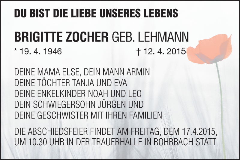 Hier finden Sie alle Traueranzeigen aus der Zeitung, die bisher für Brigitte Zocher erschienen sind. Weitere Traueranzeigen, die in der Zeitung erscheinen, werden hier ebenfalls aufgelistet